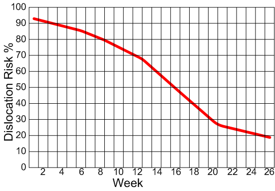 Sitting and bending to the floor causes the majority of hip dislocations, and although most of the risk will be over after six months, you should not expect to be completely healed until around twelve months after the operation. [morriewynn]